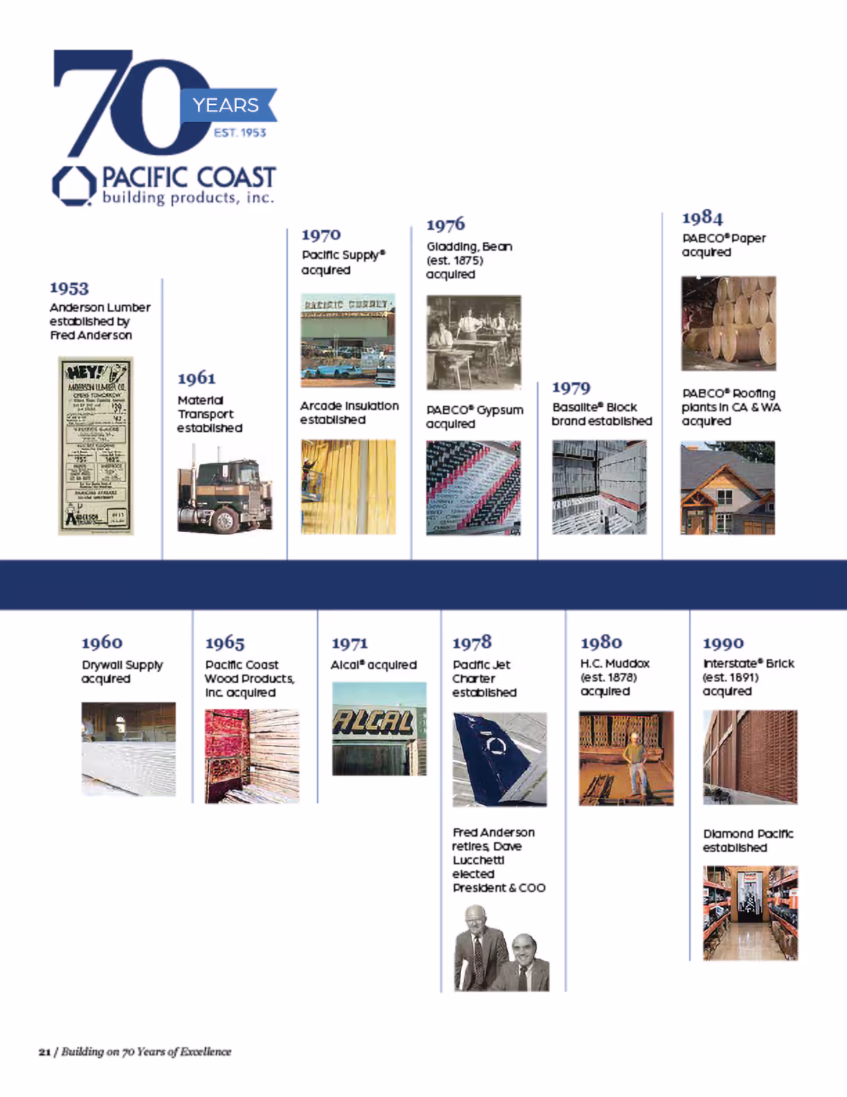 Narrative: "As the company grew, it diversified into manufacturing, contracting, and distribution, with a focus on sustainable building solutions. Each acquisition brought new expertise, allowing PCBP to shape the landscape of cities across the Western United States."